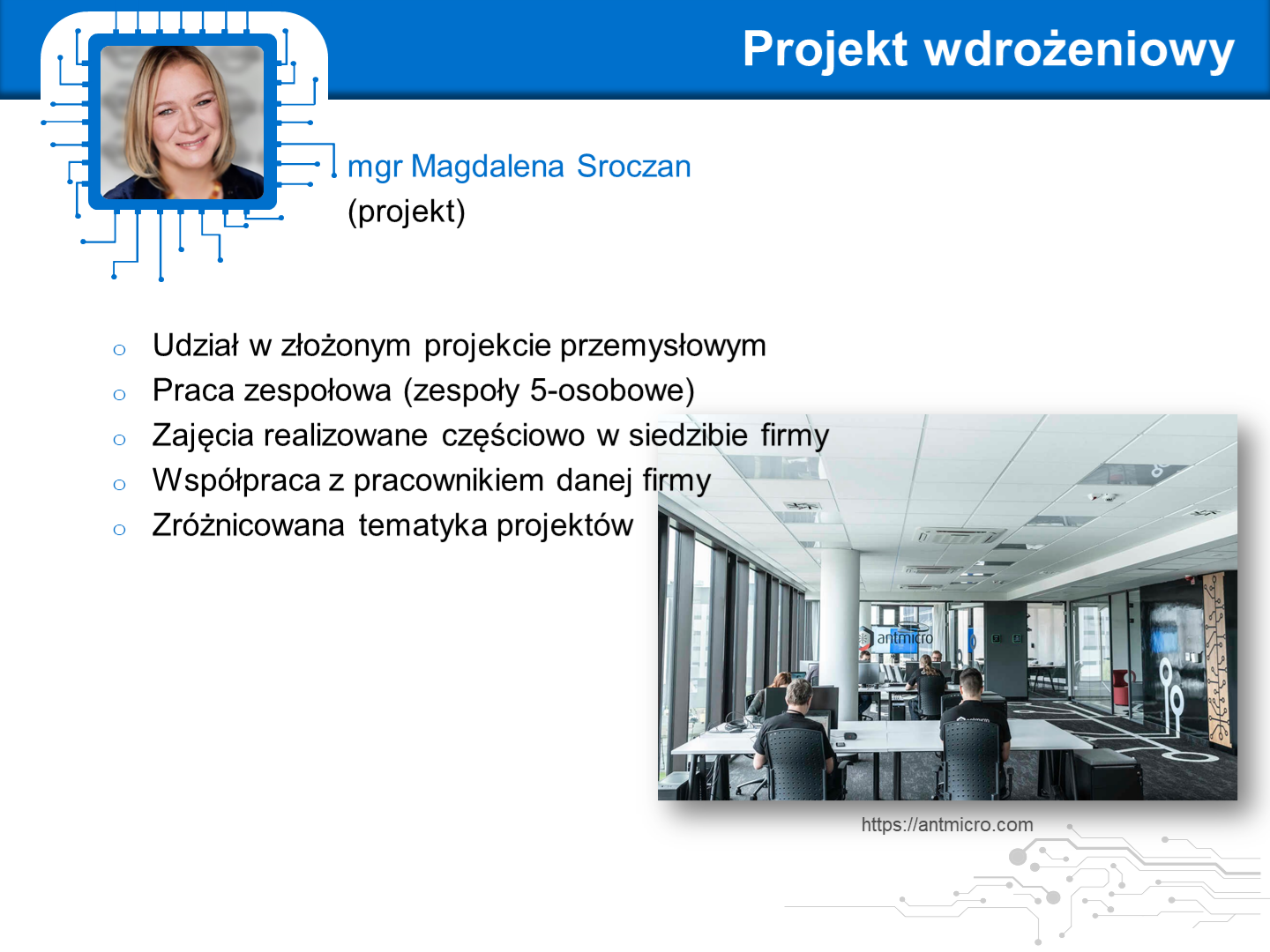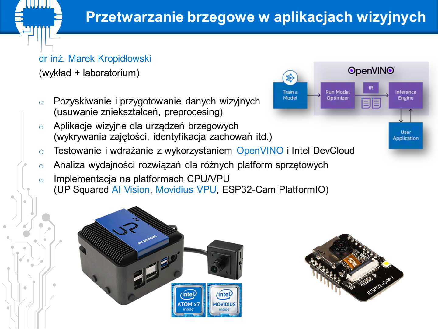 Zapraszamy na studia magisterskie na specjalności Przetwarzanie brzegowe, którą współtworzymy z Intelem: Rekrutacja. Wspólnie z życzliwą kadrą dydaktyczną poznasz najnowsze technologie z pogranicza AI i elektroniki, weźmiesz udział w zajęciach prowadzonych przez inżynierów z branży IT, zrealizujesz ciekawe projekty wdrożeniowe oraz pracę dyplomową we współpracy z programistami z gdańskiego oddziału Intela. Więcej na temat specjalności: Przetwarzanie brzegowe.